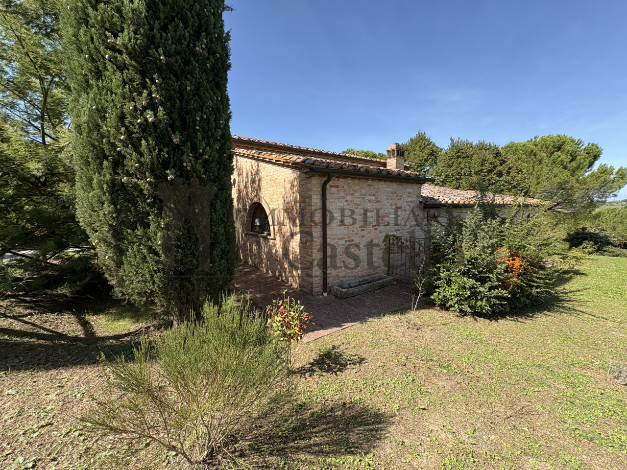 Adagiato sulle dolci colline tra il Lago Trasimeno e Il Lago di Chiusi, autentico casale in pietra circondato da un giardino con uliveto e vigneto, che si estende per oltre un ettaro e mezzo.