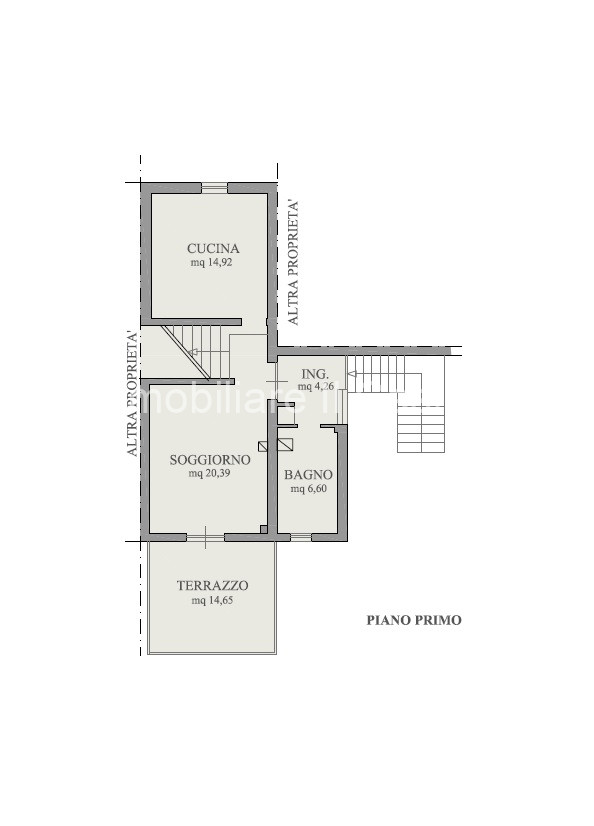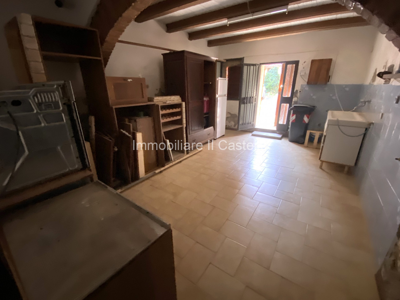 Al piano primo, ingresso, ampio soggiorno con terrazzo di 14 mq e camino, cucina abitabile e bagno.